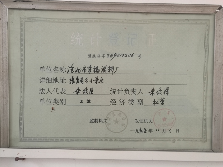 統計登記證 冀統登字第092102116號 單位名稱滄州市幸福調料廠 詳細地址張官屯鄉(xiāng)小朱莊 發(fā)證機關:滄縣統計局 監(jiān)制機關:河北省統計局 一九九五年八月三日